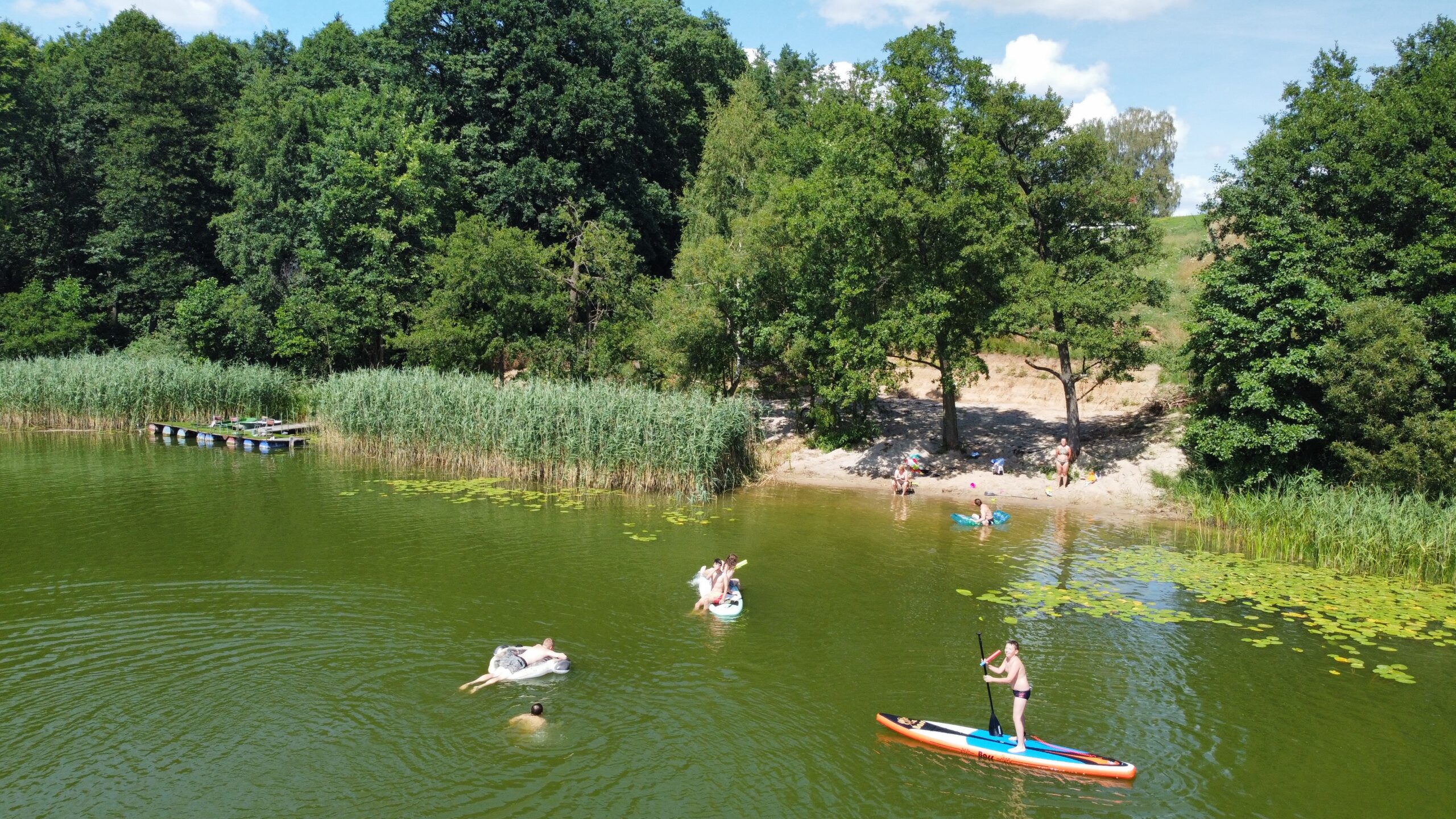 Czeka tutaj na Ciebie kameralna, prywatna plaża z pomostem i łagodnym zejściem do wody. Możesz zarówno poleżeć z książką, jak i wskoczyć na SUP-a spędzając aktywnie czas!